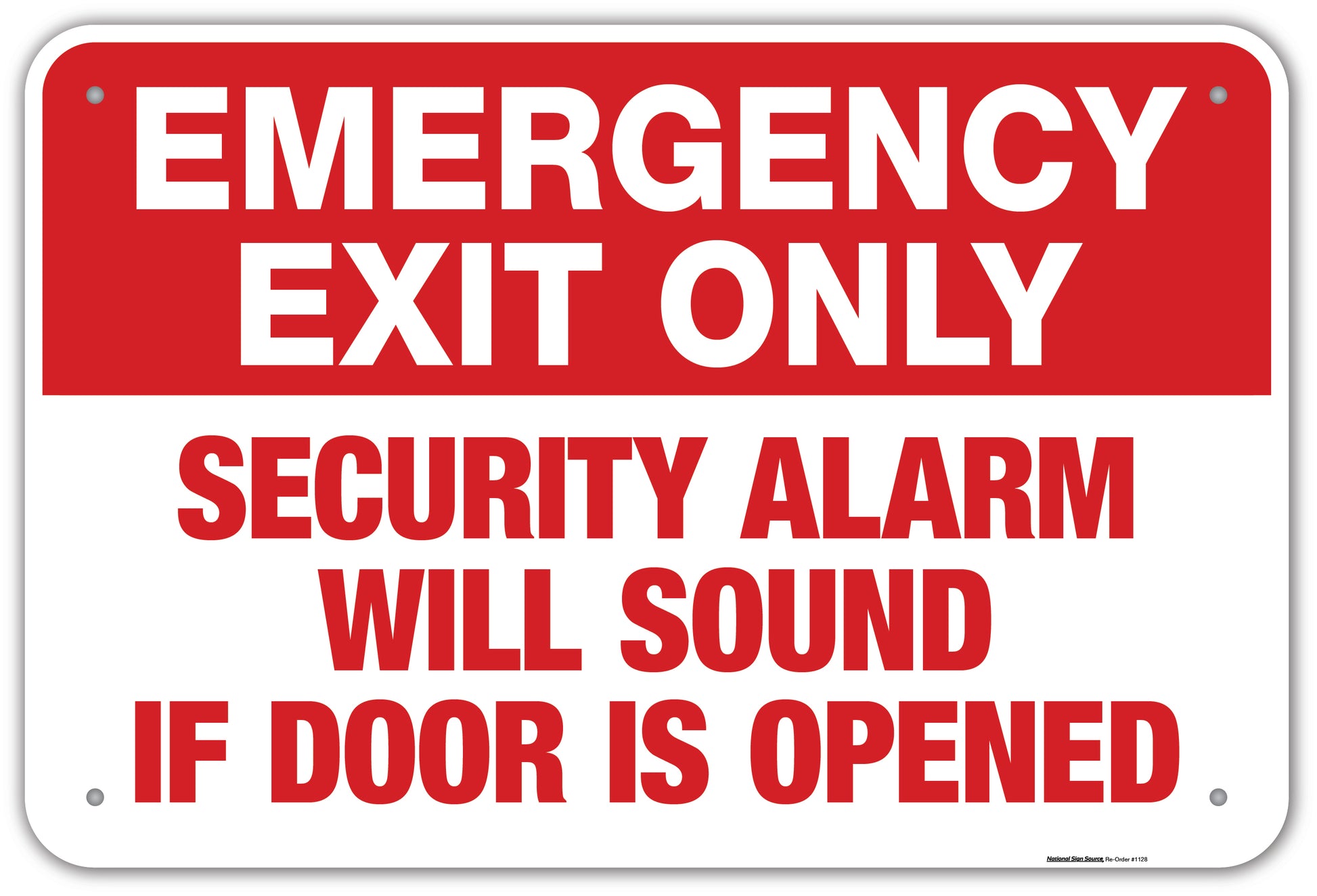 Emergency Exit Security Alarm Will Sound Signs to mark emergency exits and warn triggering a security alarm when opened. Vinyl signs are peel and stick for easy installation on most doors and walls. Dibond and aluminum signs can install easily with screws or nails with pre-punched mounting holes.